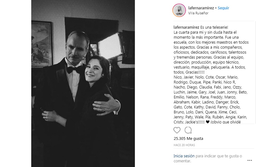 "Es una teleserie! La cuarta para mi y sin duda hasta el momento la más importante. Fue una escuela, con los mejores maestros en todos los aspectos. Gracias a mis compañeros, oficiosos, dedicados, cariñosos, talentosos y tremendas personas. Gracias al equipo, dirección, producción, equipo técnico, vestuario, maquillaje, peluqueria. A todos, todos, Gracias!!!!!!", escribió Fernanda Ramírez.