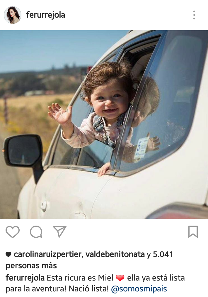 "Esta ricura es Miel ❤ ella ya está lista para la aventura! Nació lista! @somosmipais", escribió Fernanda junto a una tierna imagen donde se ve a su sobrina saludando por la ventana de un auto.