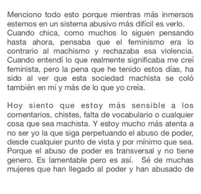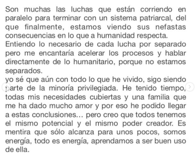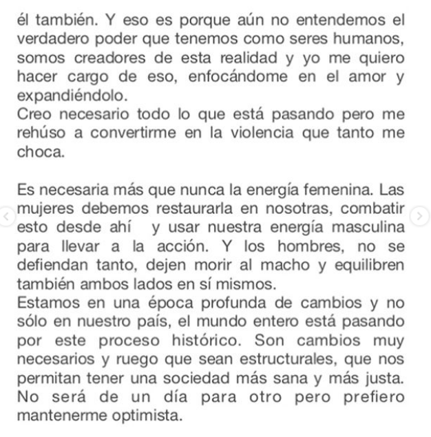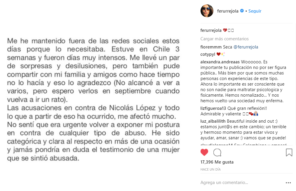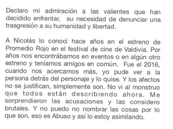 "Me he mantenido fuera de las redes sociales estos días porque lo necesitaba (...)Las acusaciones en contra de Nicolás López y todo lo que a partir de eso ha ocurrido, me afectó mucho (...) Declaro mi admiración a las valientes que han decido enfrentar, su necesidad de transgresión a su humanidad y libertad" fue parte de lo que escribió.