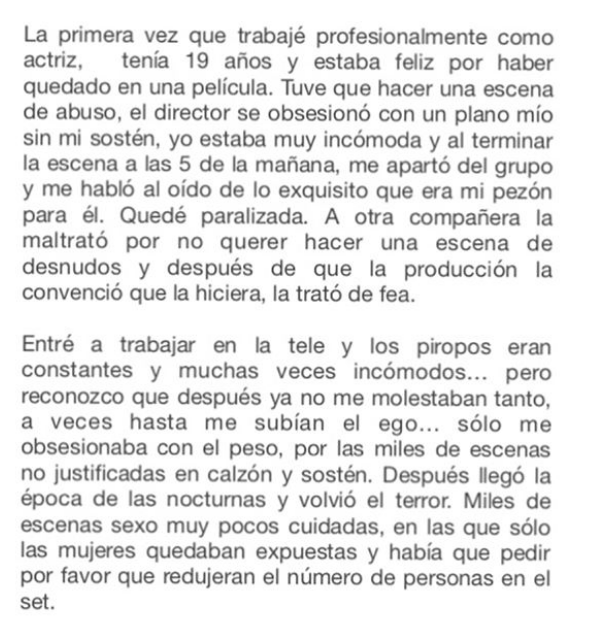 "Creo que mi infancia y todo mi período de desarrollo estuvo marcado por "abusos" titulados de otro modo. La primera vez que trabajé como actriz, tenía 19 años y estaba feliz por haber quedado en una película... el director se obsesionó con un plano mío sin sostén, yo estaba muy incómoda", fue parte de lo que escribió.