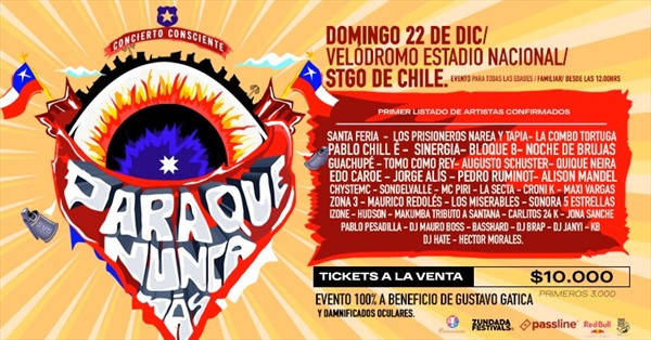 El evento llamado "Para que nunca más" tendrá lugar en el Velódromo del Estadio Nacional y mezclará música y humor dentro de su programación. Algunos de los artistas presentes serán: Santaferia, Guachupé, Pablo Chill-E, Augusto Schuster, El Bloque 8, Noche de Brujas, La Combo Tortuga, Tomo Como Rey, Sinergia, Narea & Tapia, entre otros.