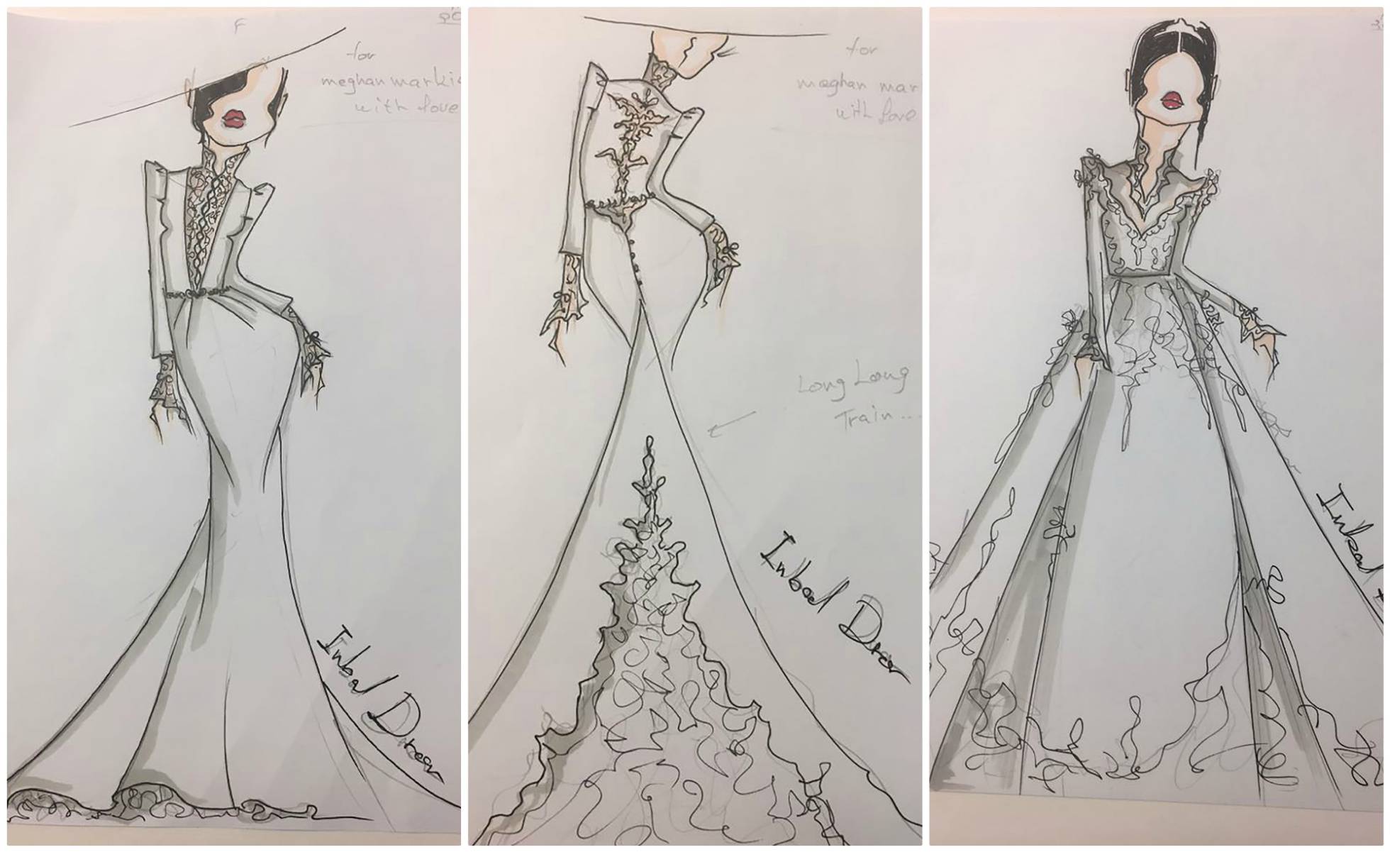 Sin embargo, el sitio web TMZ publicó inmediatamente los tres supuestos bocetos de los trajes de novia del diseñador. Se trata de 3 vestidos entallados y con mangas largas que tienen como principal característica, los volantes en cuellos y brazos.