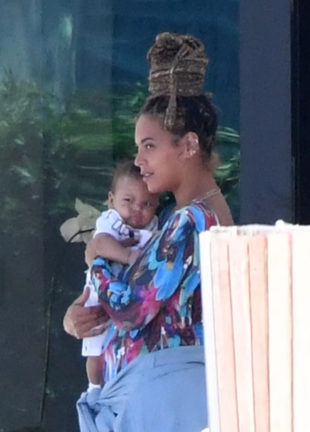 La publicación revela que en las fotos captadas por por paparazzi, vemos a la artista estadounidense de 36 años en una residencia en Miami luciendo un look relajado y sosteniendo entre sus brazos a Sir.