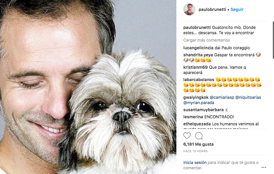 El actor Paulo Brunetti sufrió un amargo momento tras la desaparición de una de sus mascotas. Se trata de Gaspar, un shih tzu de 7 años. En su cuenta de Instagram comenzó una campaña para poder encontrarlo, pidiendo ayuda a sus seguidores