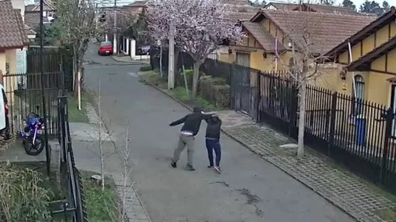 Estas imágenes fueron captadas por una cámara de seguridad en el pasaje Los Olmos de la comuna, donde se ve que el hombre agrede en varias ocasiones a la mujer. Esto habría ocurrido el sábado en la mañana.