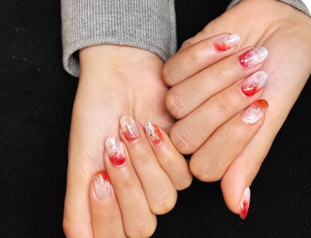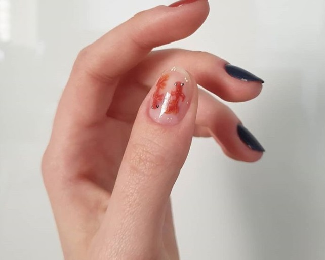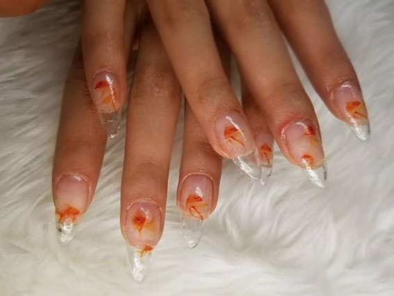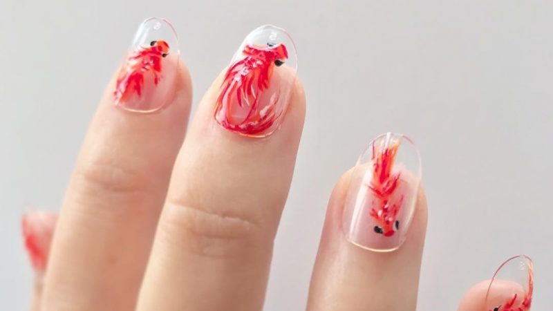 Se trata de una fusión entre las uñas jelly (gelatinosas) con el dibujo de una carpa dorada, que es un característico pez rojizo-anaranjado del país oriental.
