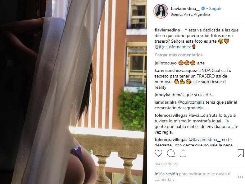 Pero la polémica no quedó ahí, ya que para mostrar que sabe tomarse la cosas con humor, Flavia compartió otra imagen donde muestra por completo su trasero. La imagen estaba acompañado de un directo mensaje a quienes la critican, donde señala "Y esta va dedicada a las que dicen que cómo puedo subir fotos de mi trasero? Señora esta foto es arte".