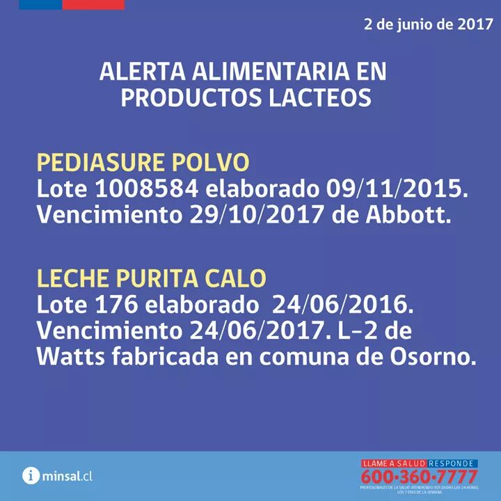 Se trataría de Pediasure en polvo, Lote 10008584, y Leche Purita Calo, lote 176.