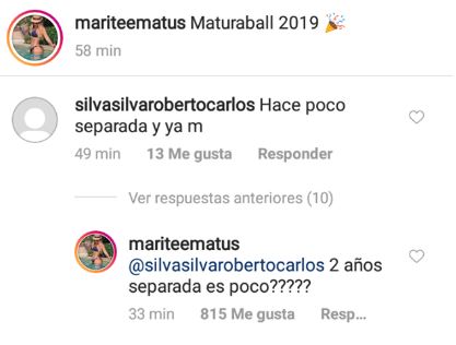 No obstante, no todo fueron felicitaciones. Marité también recibió un desubicado comentario de un usuario que la criticaba por estar 'tan rápido en pareja'. Ella no dudó en responder: "¿2 años separada es poco?", escribió.