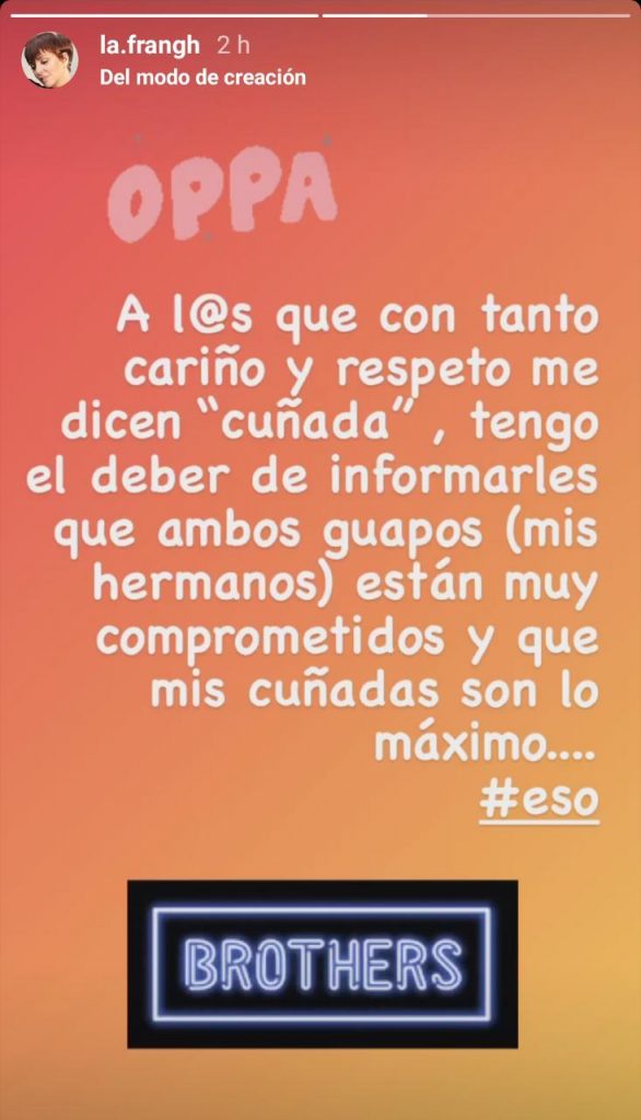 Y los hermanos de Fran causaron furor, a tal punto, que luego subió otra historia 'parándole los carros' a sus seguidoras, que ya la andaban llamando 'cuñada'.