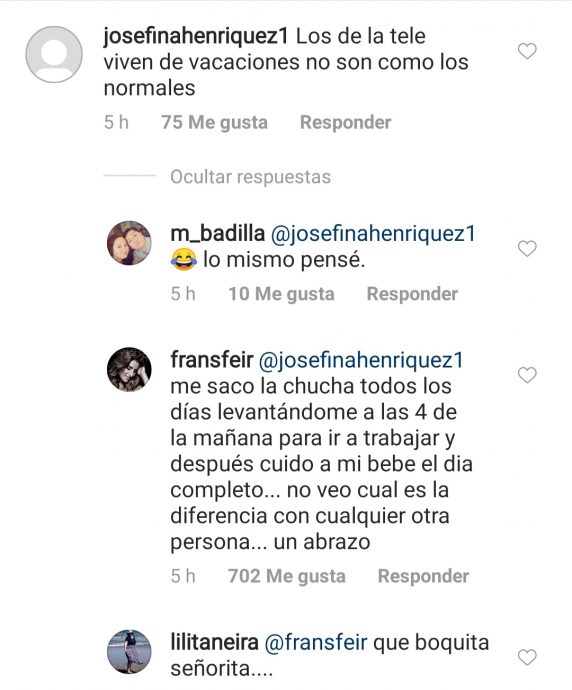 Si bien la postal fue aplaudida por varios de sus seguidores, hubo ciertos comentarios negativos, acusando que ellos se toman 'demasiadas vacaciones'. «Los de la tele viven de vacaciones no son como los normales», fue uno de esos comentarios, el que rápidamente fue respondido por la propia Fran, demostrando claramente su molestia.