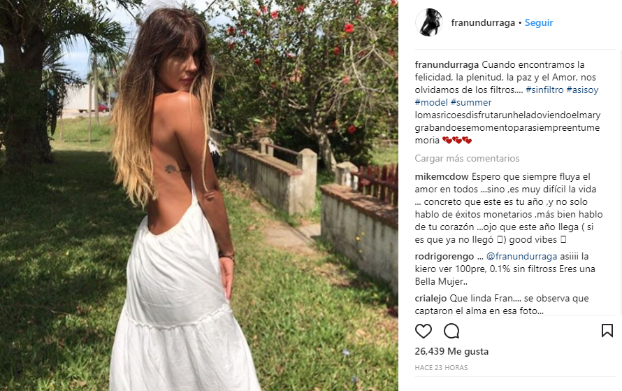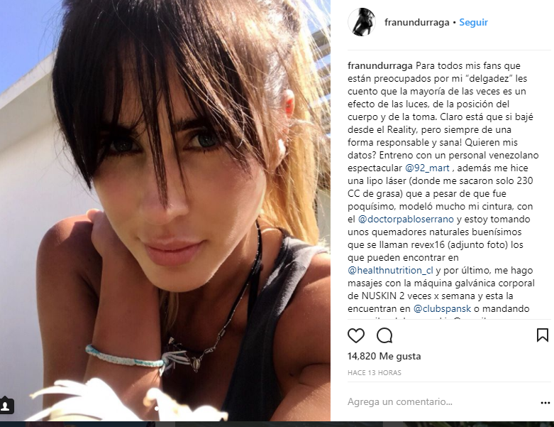 Pero el miércoles en la noche, Fran Undurraga subió nuevamente una fotografía, hablando del tema: "Para todos mis fans que están preocupados por mi “delgadez” les cuento que la mayoría de las veces es un efecto de las luces, de la posición del cuerpo y de la toma. Claro está que si bajé desde el Reality, pero siempre de una forma responsable y sana!"
