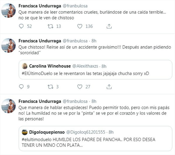 Por lo demás, otro usuario comentó que los padres de Undurraga se veían "humildes" y que por eso ella "desea tener un mino con plata". Comentario que la joven respondió bastante molesta.