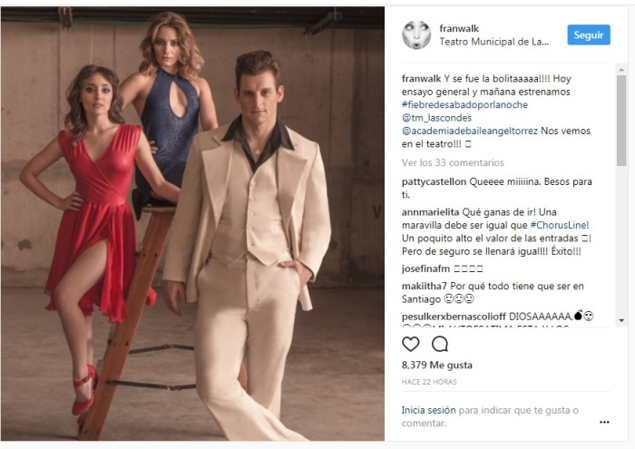 A través de Instagram la actual actriz de “Tranquilo papá” compartió un adelanto de los looks con los que se lucirán en el escenario del Teatro Municipal de Las Condes. Acompañada de Eyal Meyer y de la actriz Josefina Fiebelkorn, Francisca se lució sobre una escalera, usando un sexy vestido rojo con un tajo en la pierna, además de un maquillaje muy característico de la onda disco.