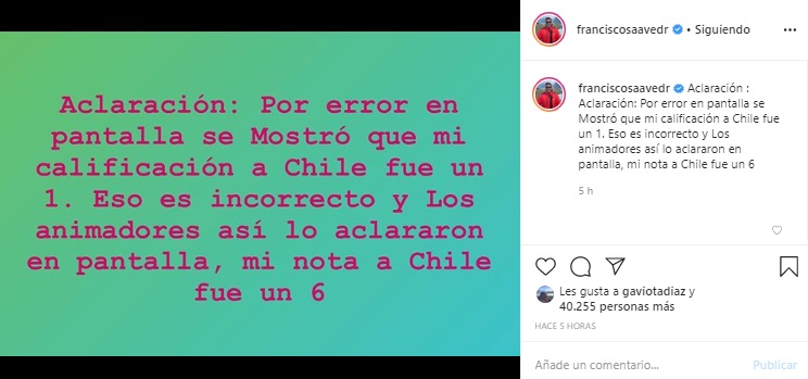'Aclaración: Por error en pantalla se mostró que mi calificación a Chile fue un 1. Eso es incorrecto y los animadores así lo aclararon en pantalla. Mi nota a Chile fue un 6', expresó Saavedra.