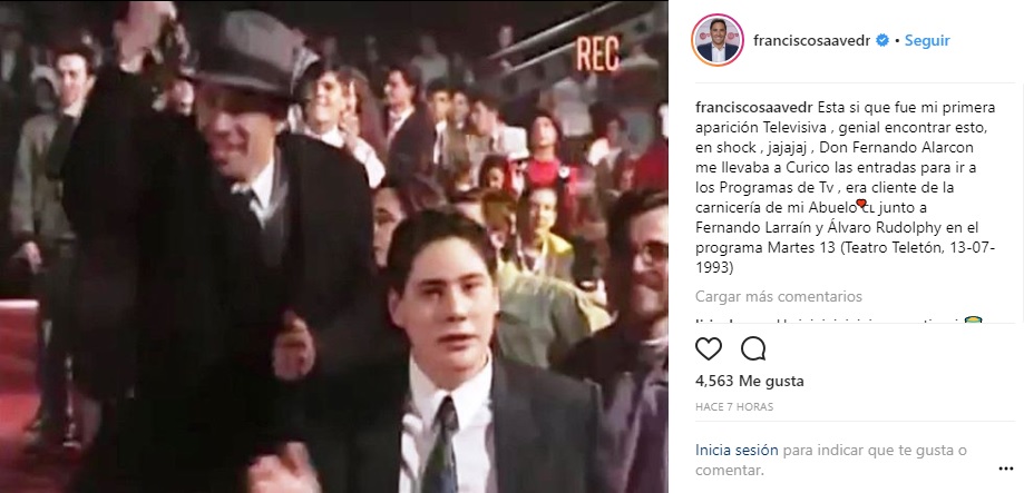 "Esta sí que fue mi primera aparición televisiva, genial encontrar esto, en shock. Don Fernando Alarcón me llevaba a Curicó las entradas para ir a los programas de TV, era cliente de la carnicería de mi abuelo", escribió el rostro de Canal 13 para acompañar la imagen en la que aparece junto a Fernando Larraín y Álvaro Rudolphy en el extinto programa "Martes 13".