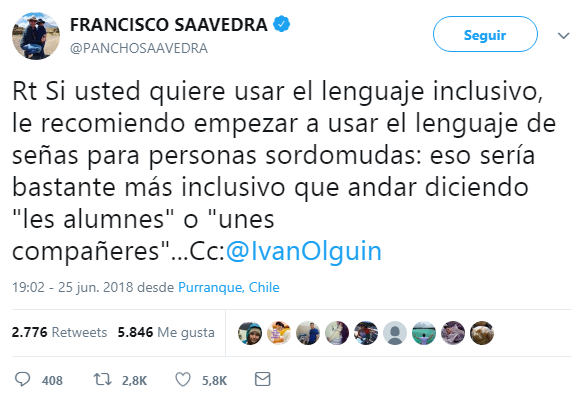 El conductor de "Lugares que Hablan" escribió: "Si usted quiere usar el lenguaje inclusivo, le recomiendo empezar a usar el lenguaje de señas para personas sordomudas: Eso sería bastante más inclusivo que andar diciendo 'les alumnes' o 'unes compañeres'".