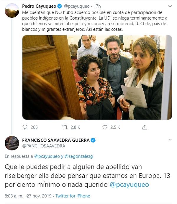 Junto a su mensaje, Cayuqueo compartió una imagen de Jacqueline Van Rysselberghe, presidenta del partido que menciona. La publicación obtuvo miles de 'Me Gusta', 'retuits' y comentarios, entre ellos el del animador, Pancho Saavedra.