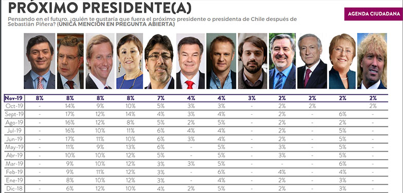 En efecto, Parisi comparte el primer escalón junto a Joaquín Lavín (UDI), José Antonio Kast (Republicano) y Beatriz Sánchez (Frente Amplio) con un 8%