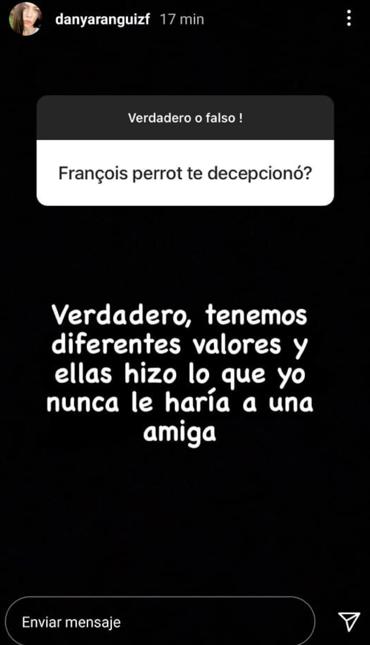 "¿Francoise Perrot te decepcionó?", le preguntaron a Daniela, mientras que ella respondió que sí. "Verdadero. Tenemos diferentes valores y ella hizo lo que yo nunca le haría a una amiga", sentenció.