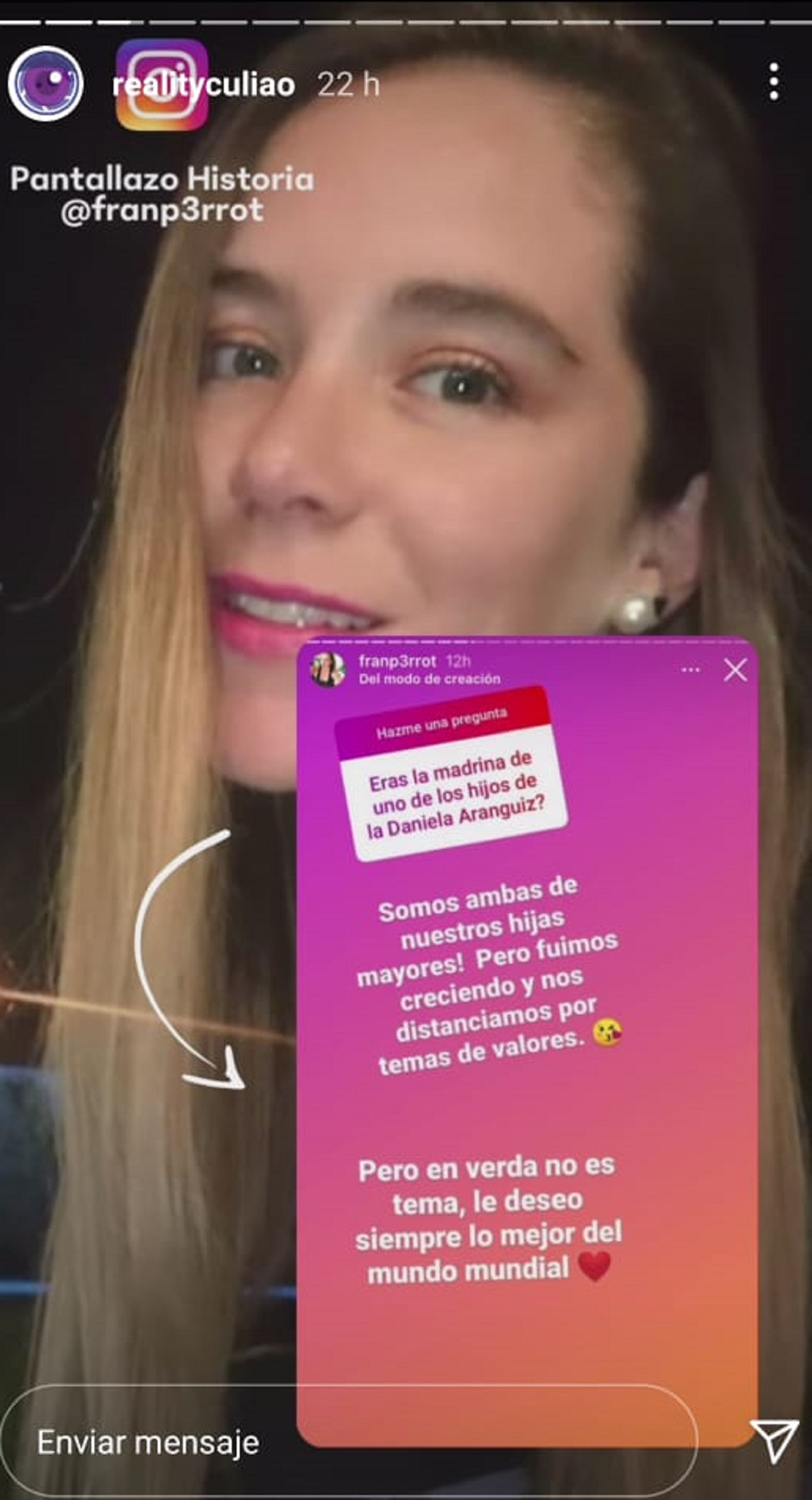 "¿Eres madrina de uno de los hijos de la Daniela Aránguiz?", le preguntaron a Francoise en Instagram, ante lo cual ella respondió: "somos ambas de nuestros hijas mayores". Luego agregó: "pero fuimos creciendo y nos distanciamos por temas de valores".