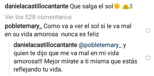 Pero en una de sus últimas publicaciones, Daniela recibió un ofensivo comentario que la molestó bastante. En una selfie donde ella escribió “Que salga el sol”, recibió varios piropos por su belleza, pero hubo una usuaria que le envió un feo mensaje, aludiendo la vida amorosa de la ex coach.