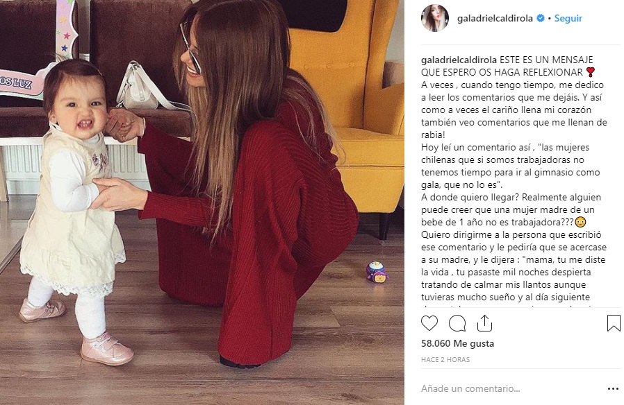 Esto fue el pasado martes, cuando Gala compartió un video de ella haciendo ejercicio. “Las mujeres chilenas que sí somos trabajadoras no tenemos tiempo para ir al gimnasio como Gala, que no lo es”, fue el comentario de una usuaria en la publicación.