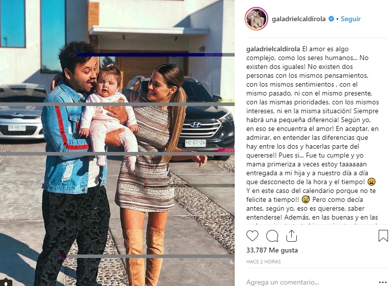 Luego, agregó que: "¡en eso se encuentra el amor! En aceptar, en admirar, en entender las diferencias que hay entre los dos ¡y hacerlas parte de quererse! Pues sí… fue tu cumple y yo mamá primeriza, a veces taaaaan entregada a mi hija y a nuestro día a día, que me desconecto de la hora y el tiempo, y en este caso el calendario, ¡¡porque no te felicité a tiempo!!! Pero como decía antes, según yo, eso es quererse, ¡saber entenderse!”.