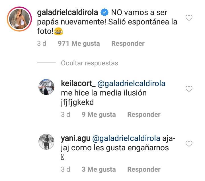 La imagen fue replicada en la cuenta de Gala y ya que las preguntas sobre el embarazo no se detuvieron, fue la propia ex chica reality quien aclaró la situación.