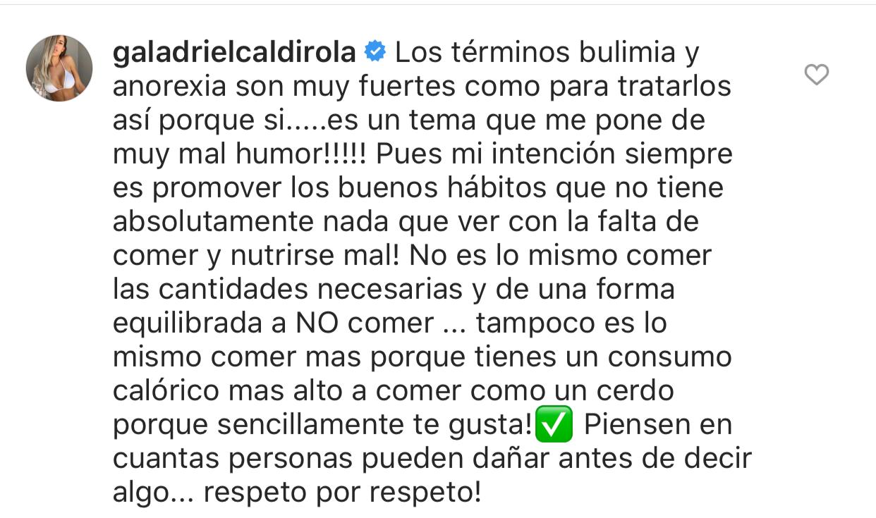 Luego Gala señaló: "no es lo mismo comer las cantidades necesarias y de una forma equilibrada a NO comer (…) Tampoco es lo mismo comer más porque tienes un consumo calórico más alto, a comer como un cerdo porque sencillamente te gusta. Piensen en cuántas personas pueden dañar antes de decir algo (…) Respeto por respeto".
