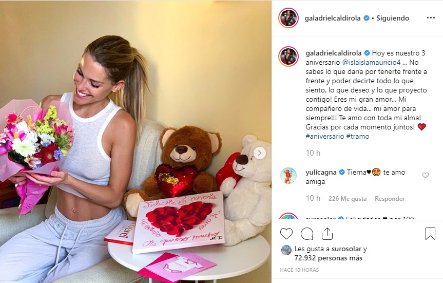 Este domingo, Gala Caldirola y Mauricio Isla cumplieron tres años desde que están juntos y, aunque fue a la distancia, ambos se dedicaron románticas palabras a través de Instagram.