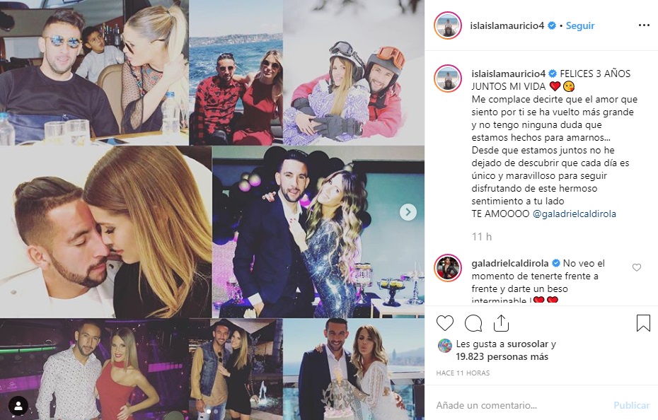 'Hoy es nuestro 3 aniversario @islaislamauricio4... No sabes lo que daría por tenerte frente a frente y poder decirte todo lo que siento, lo que deseo y lo que proyecto contigo! Eres mi gran amor... Mi compañero de vida... mi amor para siempre!!! Te amo con toda mi alma! Gracias por cada momento juntos!', escribió la española, quien posó con los regalos que le hizo llegar Mauricio en este día especial.