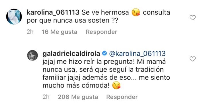 "Jajaj me hizo reír la pregunta! Mi mamá nunca usa, será que seguí la tradición familiar jajaj además de eso... ¡me siento mucho más cómoda!", respondió Gala.