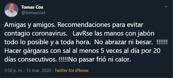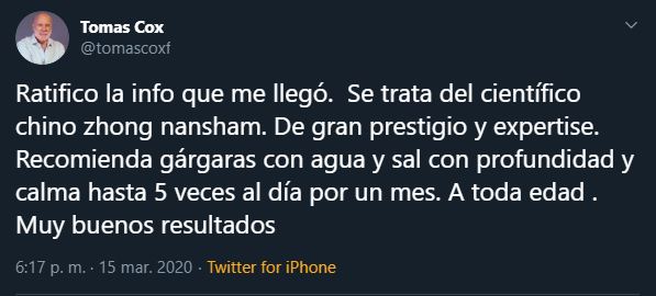 En específico, en redes sociales estaba circulando una noticia respecto a la 'milagrosa cura' contra el coronavirus. Se trata de una receta en base a solución salina que en Chile el empresario Tomás Cox difundió a través de Twitter.