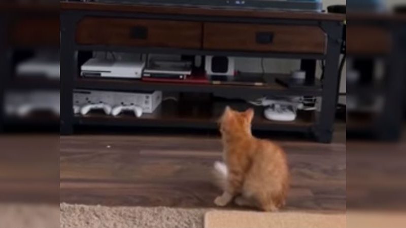 El pequeño felino estaba feliz mirando la televisión, hasta que apareció un puma animado y le provocó pánico.