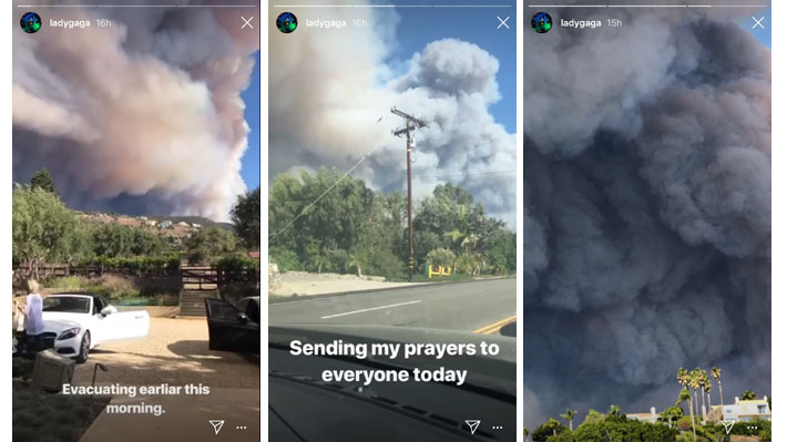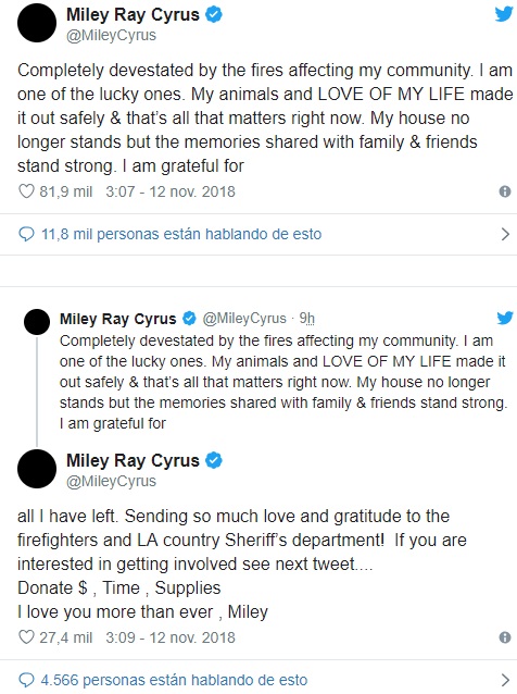 Otra de las celebridades afectadas fue Miley Cyrus, quien estaba preocupada por los animales de su propiedad, pero agradeció en redes sociales que ellos y su pareja (Liam Hemsworth) están a salvo. "Completamente devastada por los fuegos que están afectando a mi comunidad. Soy una de las afortunadas. Mis animales y el amor de mi vida están a salvo y eso es todo lo que importa ahora mismo. Mi casa ya no está en pie pero los recuerdos compartidos con mi familia y amigos se mantienen fuerte. Estoy agradecida por todo lo que me queda (…)".