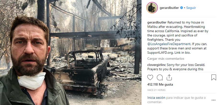 Muchos de ellos han tenido que evacuar y dejar sus viviendas ser consumidas por el fuego, y uno de los casos más impactantes fue el del actor escocés Gerard Butler, quien tuvo que evacuar por el inminente peligro que corría él y su familia. El actor de "300" pudo volver al lugar este domingo y lo que vio fue desolador. De hecho, compartió unas crudas imágenes en su Instagram donde se ve su hogar completamente convertido en cenizas.