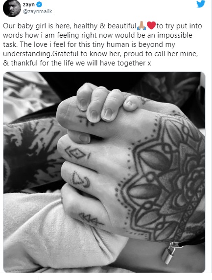 El pasado 23 de septiembre Gigi y su pareja, el ex One Direction Zayn Malik, dieron la bienvenida a su primera hija. Quien dio la noticia fue él a través de su Twitter con el mensaje: "Tratar de poner en palabras cómo me estoy sintiendo ahora sería una tarea imposible. El amor que siento por este pequeño ser humano va más allá de lo entendible. Agradecido de conocerla, orgulloso de decir que es mía y agradecido por la vida que tendremos juntos".