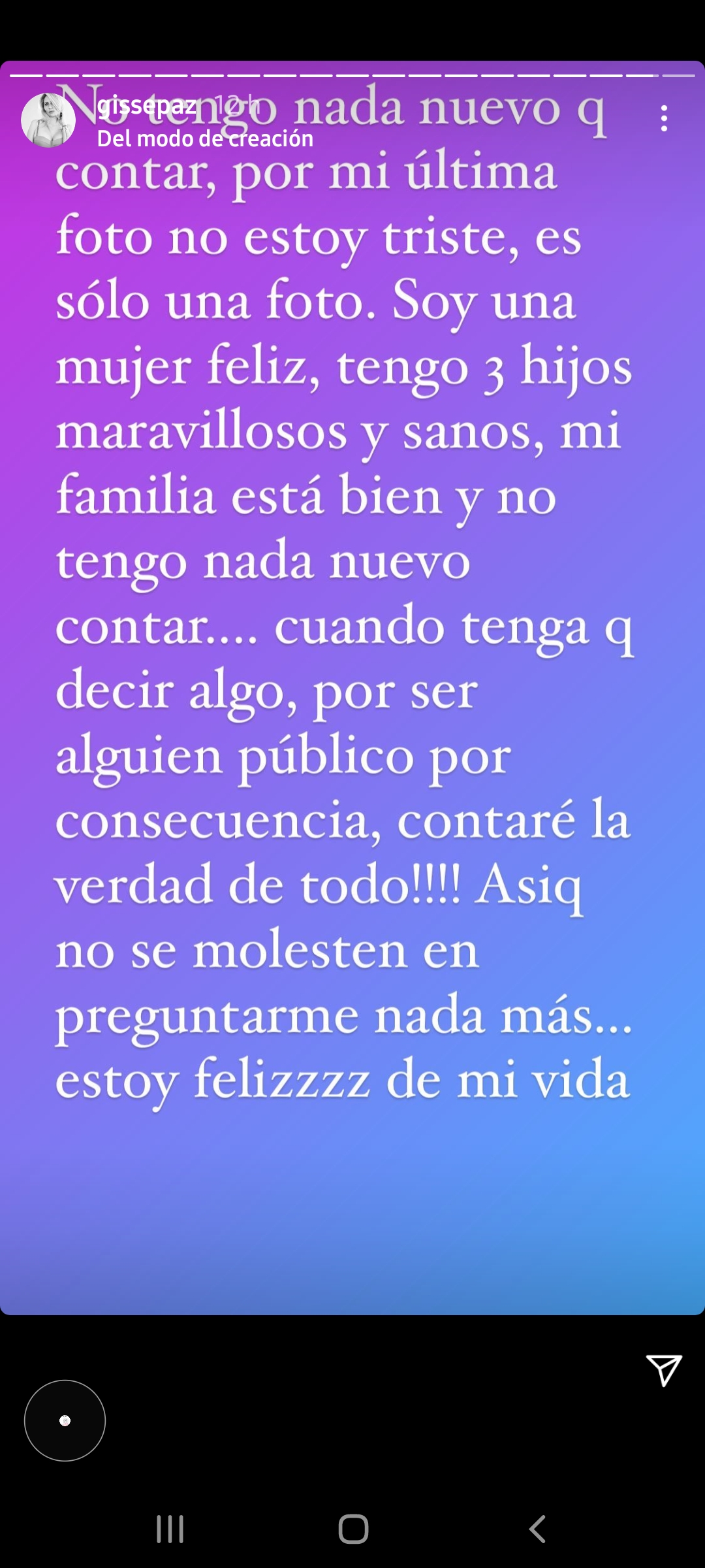 Luego, en otra historia, la modelo añadió: “No tengo nada nuevo que contar. Por mi última foto, no estoy triste, es solo una foto. Soy una mujer feliz, tengo tres hijos maravillosos y sanos, mi familia está bien, y no tengo nada nuevo que contar. Cuando tenga que decir algo, por ser alguien público, por consecuencia contaré la verdad de todo. Así que no se molesten en preguntarme nada más, estoy feliz de mi vida”.