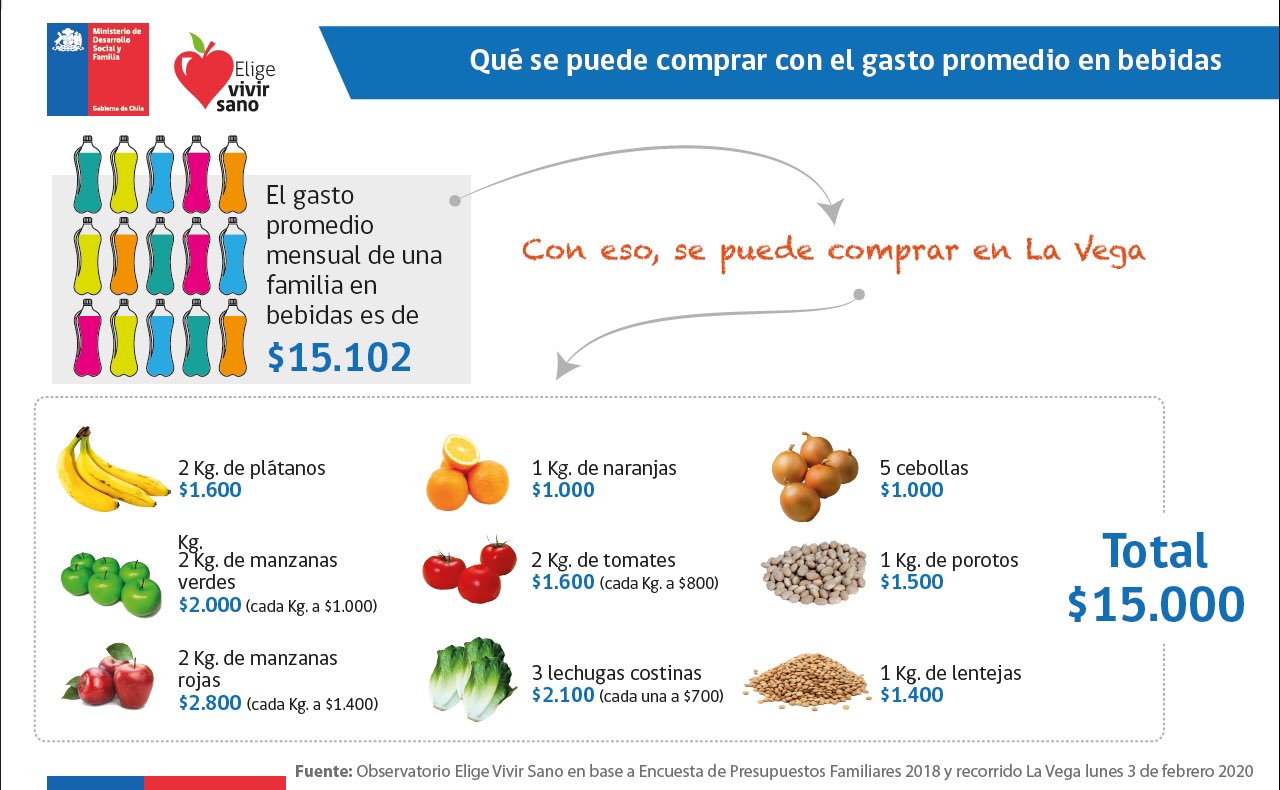 La idea es comprar estos alimentos gastando lo mismo que se gasta en los productos menos saludables y más consumidos por los chilenos. De hecho, hicieron un listado específico de los productos que ses pueden comprar en la Vega con este mismo dinero.