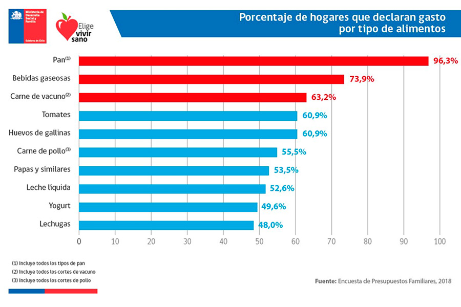 De hecho, el 96,3% de las casas chilenas declararon haber hecho un gasto en algún tipo de pan. Mientras que un 73,9 en bebida gaseosa y un 63,2 de carne de vacuno.