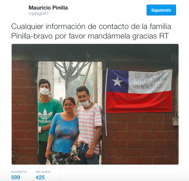 “Me llegó una foto impactante de una familia con una bandera chilena, la familia Pinilla-Bravo, me conmovió mucho e intento contactarlos para ver la posibilidad de ayudarlos”, escribió junto a la foto.