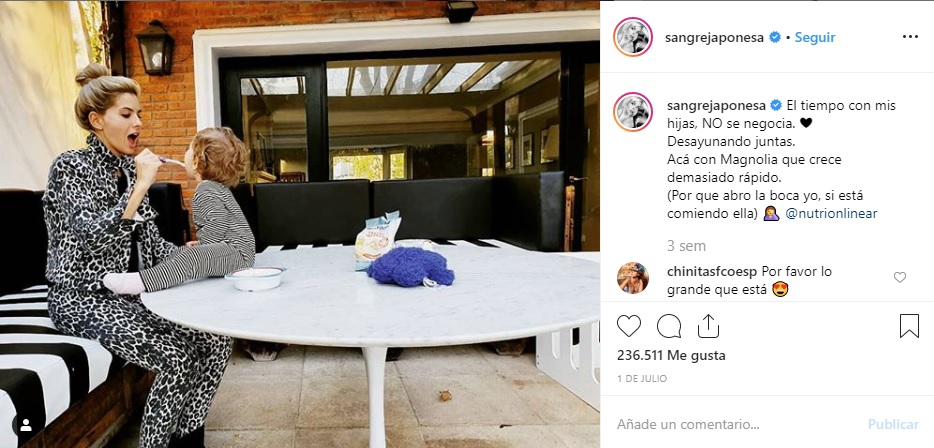 "El tiempo con mis hijas, NO se negocia. Desayunando juntas. Acá con Magnolia que crece demasiado rápido. (Por que abro la boca yo, si está comiendo ella)", fue su mensaje para acompañar la postal.