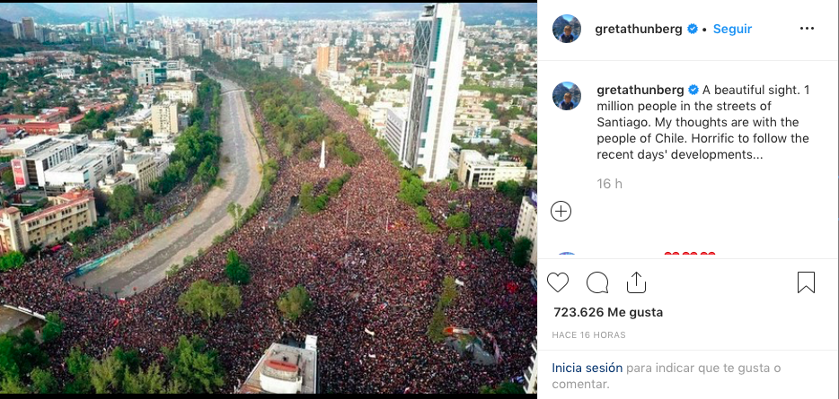 Con una foto de la masiva marcha que se realizó este viernes en Santiago y donde se estima participó más de un millón de personas, Greta escribió un mensaje para comentar que ha seguido la actualidad de nuestro país.