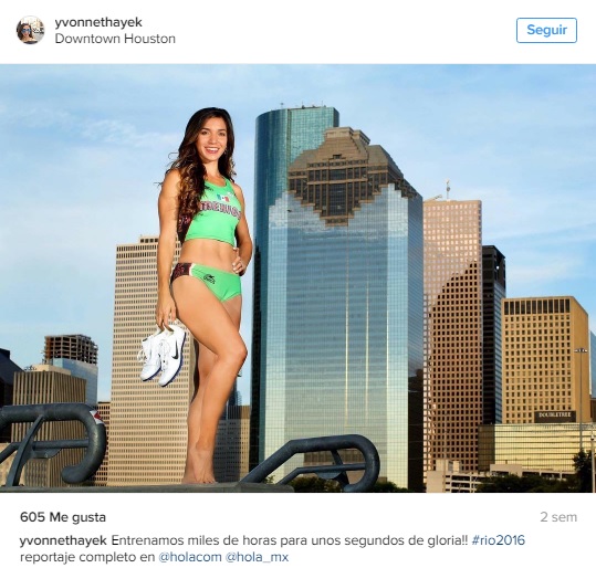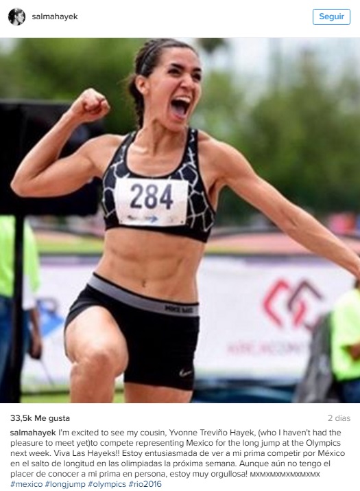 "Viva Las Hayeks!! Estoy entusiasmada de ver a mi prima competir por México en el salto de longitud en las olimpiadas la próxima semana. Aunque aún no tengo el placer de conocer a mi prima en persona, estoy muy orgullosa!", publicó la actriz en Instagram junto a una foto de su prima.