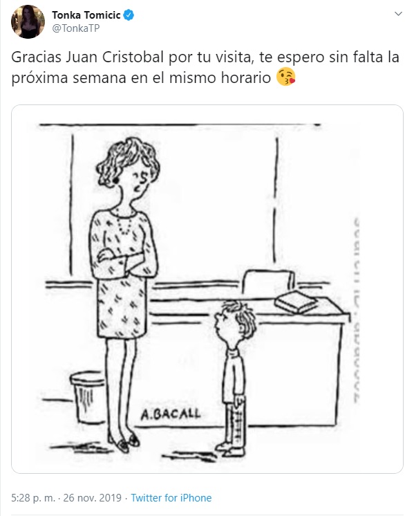 Luego Guarello se refirió específicamente al 'impasse' de la semana pasada. "A propósito del chiste de la semana pasada, porque para mí fue un chiste, para mí no se significó nada", comentó, a lo que Tonka agregó: "Para mí también. Te mandé un mensaje en Twitter, ¿lo viste?".
