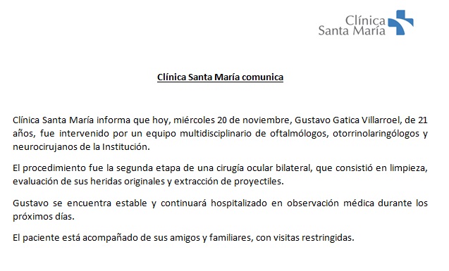 Durante la tarde de este miércoles, Clínica Santa María emitió un comunicado respecto al estado de salud de Gustavo Gatica.
