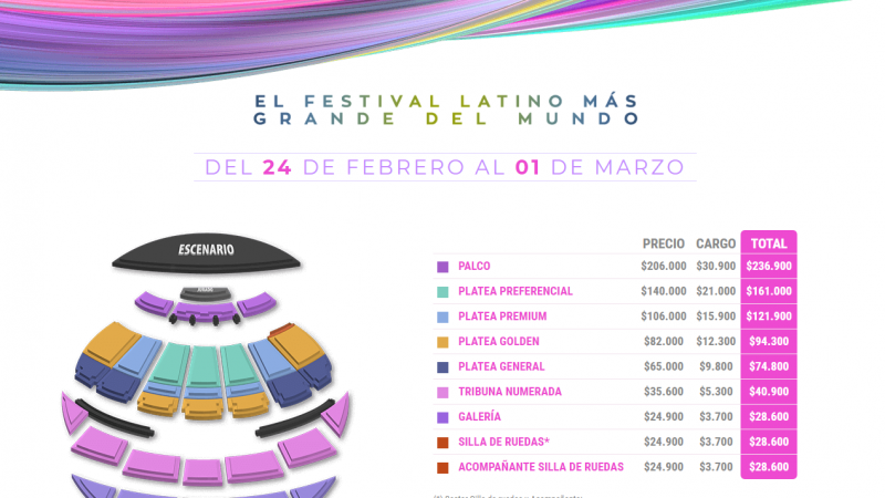 Si un Palco cuesta 230 mil pesos, en la página se ofrece a casi un millón de pesos. Lo mismo ocurre con la ubicación que le sigue, Platea Preferencial, que de 160 mil pesos, pasó a 500 mil.