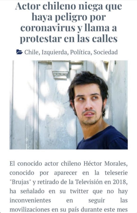 "Actor chileno niega que haya peligro por coronavirus y llama a protestar a las calles", decía el titular en cuestión, el cual generó duras reacciones hacia el intérprete. La información llegó a oídos de Héctor Morales, quien reaccionó furioso ante esta supuesta noticia. A través de su cuenta de Twitter aclaró que todo era falso.