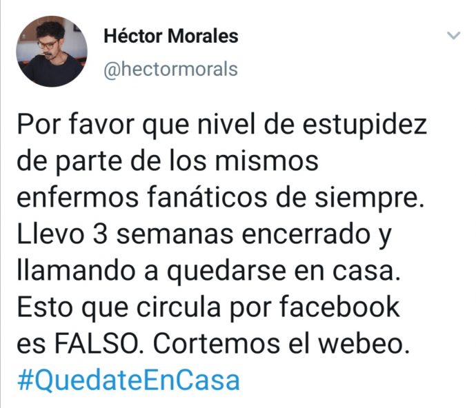 "Por favor, qué nivel de estupidez de parte de los mismos fanáticos de siempre. Llevo 3 semanas encerrado y llamando a quedarse en casa. Esto que circula en Facebook es FALSO. Cortemos el webeo. #QuedateEnCasa", señaló.